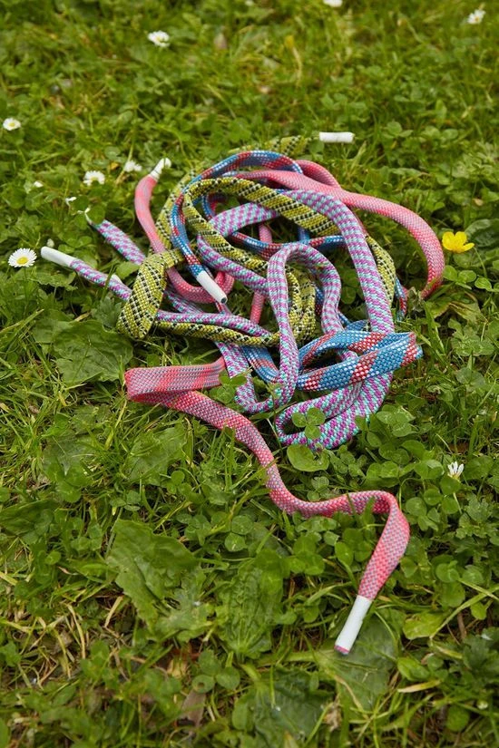 - In de capuchon zijn oude klimtouwen verwerkt als koord.